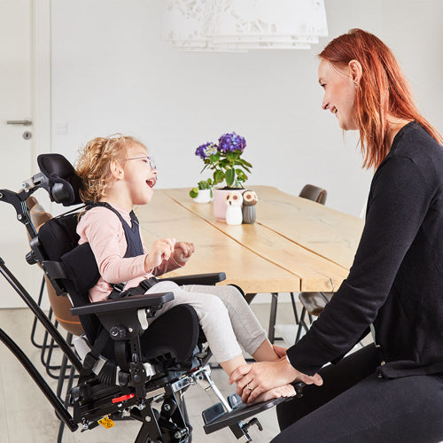 x:panda is a multi-adjustable dynamic seat, delivered in 4 different sizes - each seat with up to 12 cm in seat width and up to 20 cm of depth adjustment coupled with sliding back growth. The back is dynamic, making it possible for the child to extend and push back against relatively light resistance and then regain the desired sitting position. The back is lockable which could be preferred in feeding situations and required when being used in transportation. The back can also be angled to make it possible to seat the child with either an open or closed hip angle.